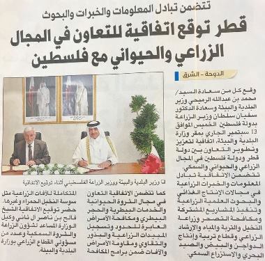 وقع كال من سعادة السيد محمد بن عبدالله الرميحي وزير البلدية والبيئة وسعادة الدكتور سفيان سلطان وزير الزراعة بدولة فلسطين يوم الخميس 13/9/2018م اتفاقية لتعزيز وتطوير التعاون بين دولة قطر ودولة فلسطين في المجال الزراعي والحيواني والسمكي