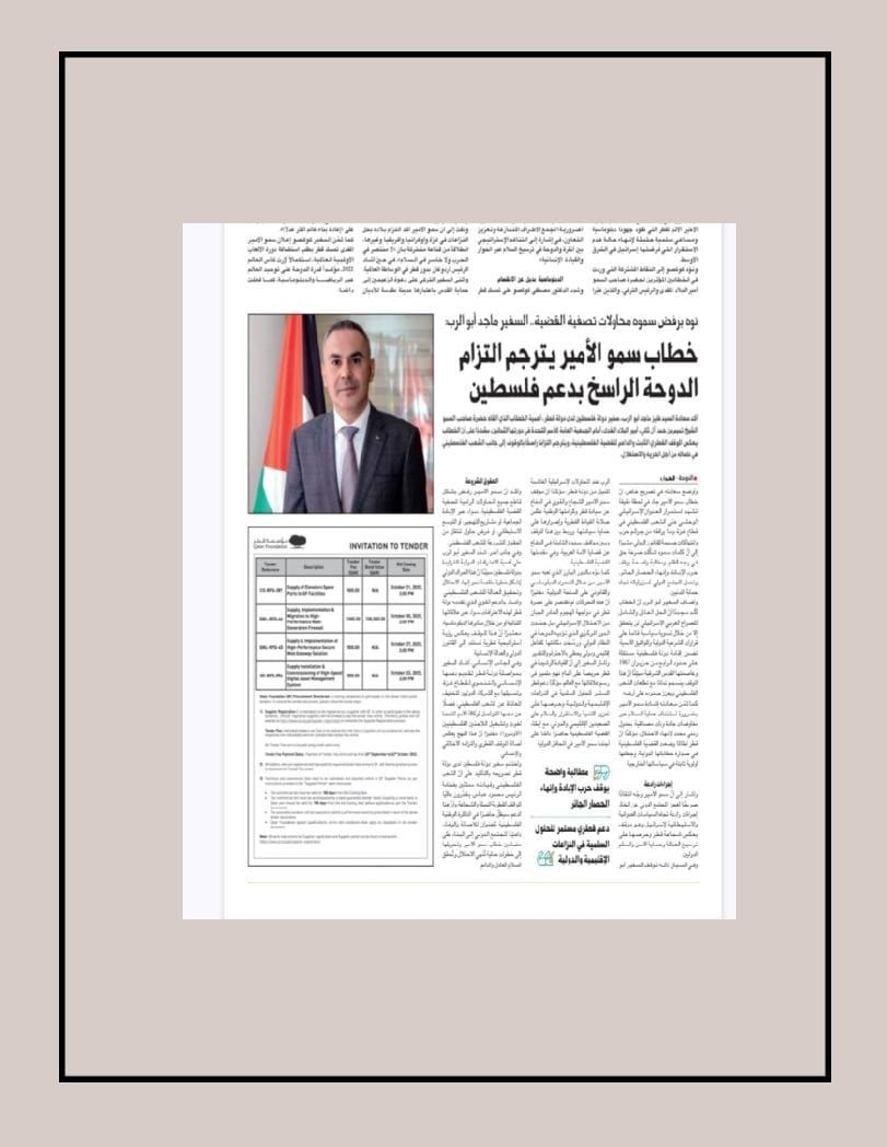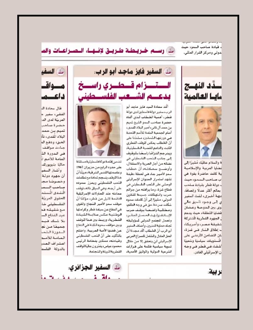 وفي السياق ذاته، توقف سفير دولة فلسطين لدى الدولة، عند المحاولات الإسرائيلية الغاشمة للنيل من دولة قطر، مثمنا موقف سمو الأمير الشجاع والقوي في الدفاع عن سيادة قطر وكرامتها الوطنية، ما عكس صلابة القيادة القطرية وإصرارها على حماية سيادتها، وربط بين هذا الموقف وبين مواقف سموه الثابتة في الدفاع عن قضايا الأمة العربية، وفي مقدمتها القضية الفلسطينية.