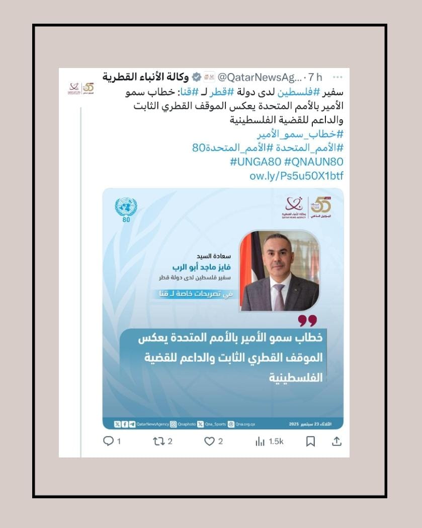 الدوحة في 23 سبتمبر /قنا/ أكد سعادة السيد فايز ماجد أبو الرب، سفير دولة فلسطين لدى الدولة، أن خطاب حضرة صاحب السمو الشيخ تميم بن حمد آل ثاني، أمير البلاد المفدى، أمام الجمعية العامة للأمم المتحدة في دورتها الثمانين، يعكس الموقف القطري الثابت والداعم للقضية الفلسطينية، ويترجم التزاما راسخا بالوقوف إلى جانب الشعب الفلسطيني في نضاله من أجل الحرية والاستقلال.